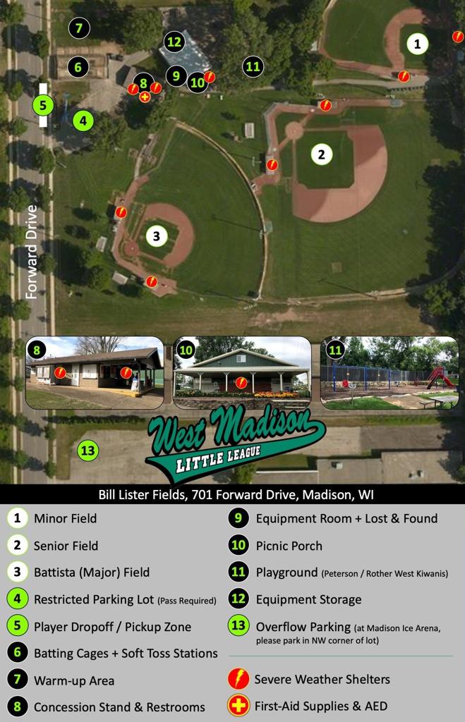 WMLL’s charming, family-friendly ballpark features a two-lane batting cage and adjacent warm-up area, concessions stand with restrooms, a play structure, a large grassy common with plentiful picnic tables, a covered picnic porch, a parking lot with handicapped and coach parking slots, and a groundskeeping / equipment storage building.